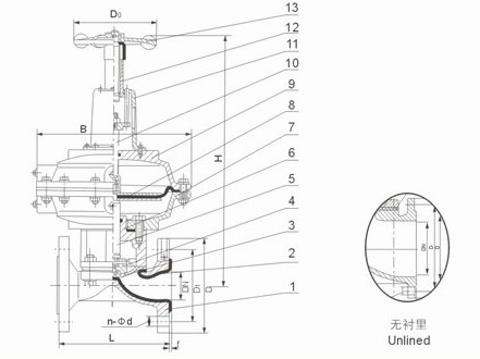 部件列表:1.閥體 2.閥體襯里 3.隔膜 4.閥瓣 5.下閥桿 6.閥蓋 7.氣缸 8.氣動薄膜 9.氣缸蓋 10.中閥桿 11.彈簧蓋 12.上閥桿 13.手輪