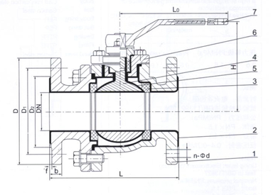 1.閥體 2.閥體襯里 3.閥座 4.球體 5.球體襯里 6.填料函 7.手柄