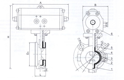 1.閥體 2.蝶圈 3.蝶板 4.四氟圈 5.碟形彈性墊圈 6.氣動(dòng)裝置