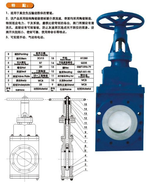 該陶瓷干灰閥采用結構陶瓷做密封副,耐沖刷,耐磨性好。中閥腔設置刮灰、阻灰裝置,有效防止灰渣進入閥腔上部,閥體底部設有卸灰盲板,從而從根本上解決了積灰、存渣導致的閘板卡澀問題,根據不同工況可設置吹掃口適用于干灰統、渣漿等介質的輸送系統中,維護簡單,使用壽命長。