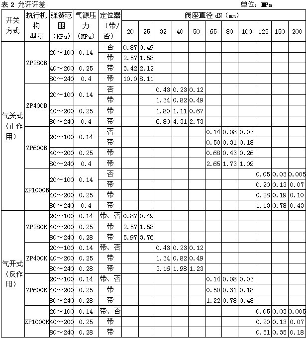 注 1)對于ZXPW型單座波紋管密封調節閥,最大允許壓差為1.0MPa,表中數據若數值小于1.0MPa則不變,