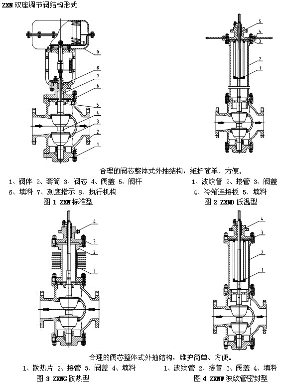 ZXN型新系列氣動(dòng)薄膜雙座調(diào)節(jié)閥采用雙導(dǎo)向結(jié)構(gòu),配用多彈簧執(zhí)行機(jī)構(gòu),具有結(jié)構(gòu)緊湊、重量輕、動(dòng)作靈敏、